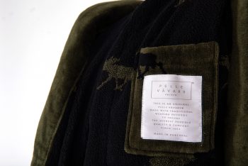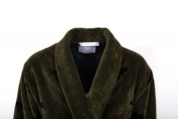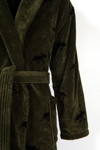 Our bathrobe Glösa green is named after a small village where the brave and wise hunters lived. By digging deep pits, they managed to catch the largest land mammal in Europe, the Moose. The bathrobe is woven in a dark colors base with a pattern by the King of the Forest in contrast to the base color. The bathrobe is based on previous patterns from Pelle Vävare and is usually a lavish and luxurious bathrobe with cut terry spun on organic cotton of very high quality.
